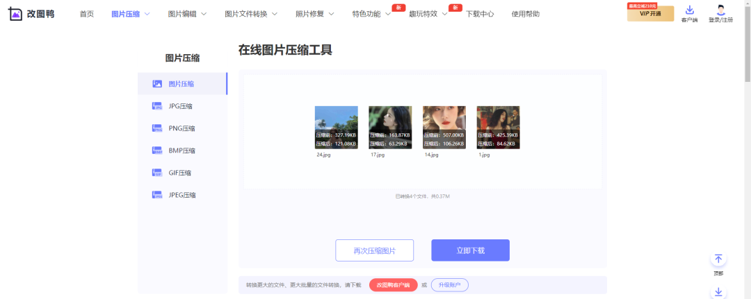选择好压缩模式后点击开始压缩,网站就会自动压缩图片,稍过一会儿,就能得到压缩后的图片了,可以直接在页面上看图片压缩前后的体积大小对比,最后点击立即下载就能免费下载压缩后的图片了
