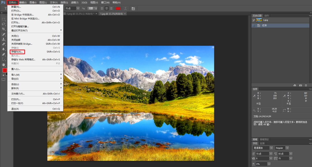 在PS中打开需要压缩的图片,然后在左上角依次点击【文件】-【储存为...】。