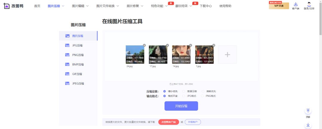 选择首页的图片压缩功能,上传需要压缩的图片,支持批量压缩,可以一次上传多张图片同时压缩,网站提供了多种压缩模式,包括缩小优先、清晰优先、普通压缩等,根据自己的需要选择对应的功能