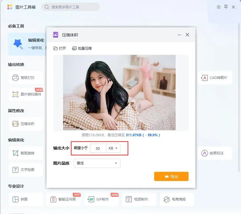 接着输入自己想要压缩的具体数值,并设置图片品质,最后点击【导出】即可将图片压缩到指定大小。