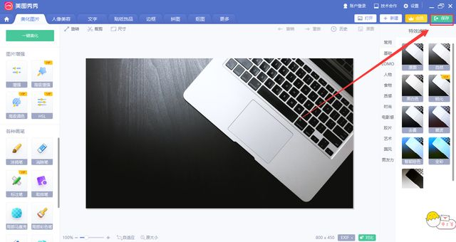 美图秀秀压缩图片实际就是在导出的时候,通过调整画质起到一个压缩的作用,操作也很简单,在美图秀秀中打开需要压缩的图片,点击右上角的“保存”按钮。