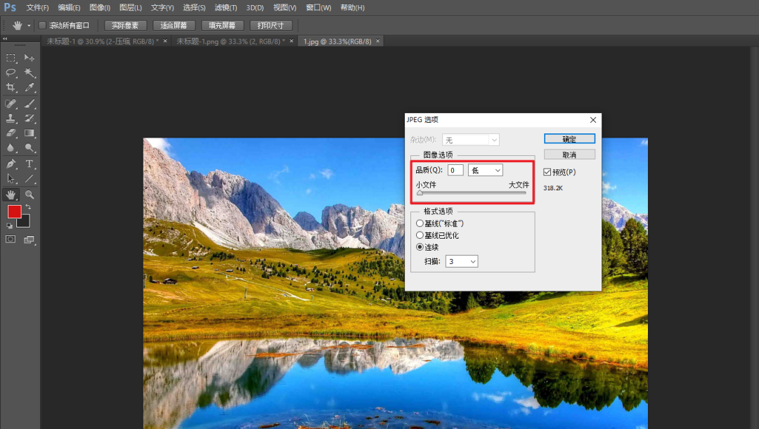 选好储存位置之后,就可以看到JPEG选项了,将品质移动到最左边小文件,右侧就可以看到预计大小,选好之后点击【确定】就行了。