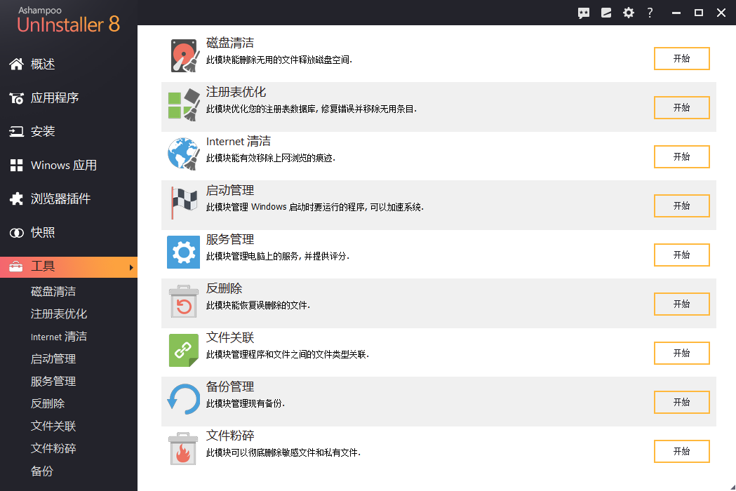 除了卸载工具之外,还有一些实用工具可以使用,包括磁盘清理、注册表优化、文件粉碎、注册表整理、Internet清洁、自启管理等等,总之就是能够让你的电脑更干净更流畅。