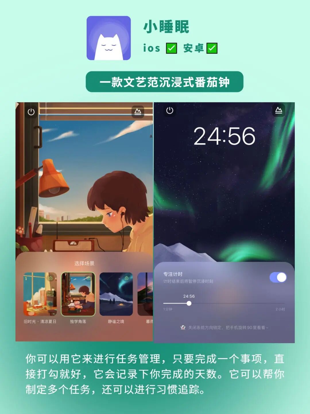 它里面有个沉浸时刻的功能,你可以选择自己喜欢的场景,每个场景都有独特的设计风格和专属的音乐,可以自定义设置计时的时间。
