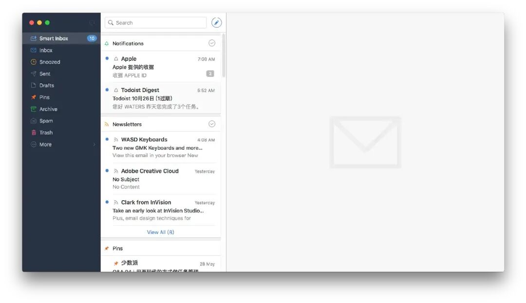 Mac 的原生邮件应用可能对新用户不是那么的友好,当然我这个老用户也没有选择使用原生的邮件。原生客户端时常会根据自己的心情,对你实施服务器断开连接,邮件龟速发送等感人操作,所以不得不为大家推荐一款第三方的邮件客户端。Spark 邮件客户端是 Readdle 公司出品的一款免费邮件客户端,除了邮件提示相当及时以外,可以配置功能的自由度也比较高,当然还有不错的颜值。