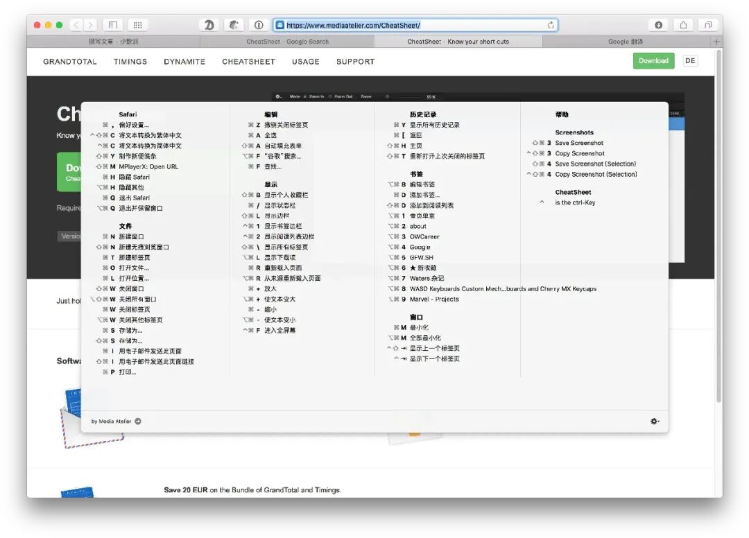 Mac 系统和各类软件拥有繁多的快捷键,想要全部记住几乎不可能。安装 CheatSheet 应用后,只要在任意程序中长按 ⌘ (Command) 键约两秒,屏幕中央便会弹出一个浮动窗口,列出该程序所有的快捷键列表。系统自带的 Finder、Safari,或是第三方的 QQ、VMware,它都能完美支持。通