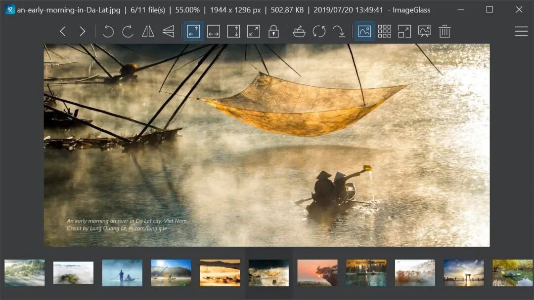 标题栏下方是一排常用小工具按钮,可自定义,包括调整大小、旋转、显示缩略图、全屏等功能。中间就是照片主体了,下方是同文件夹下其它图片缩略图。支持包括 SVG, HEIC, WebP 和 RAW 在内的 70 多种图片格式。