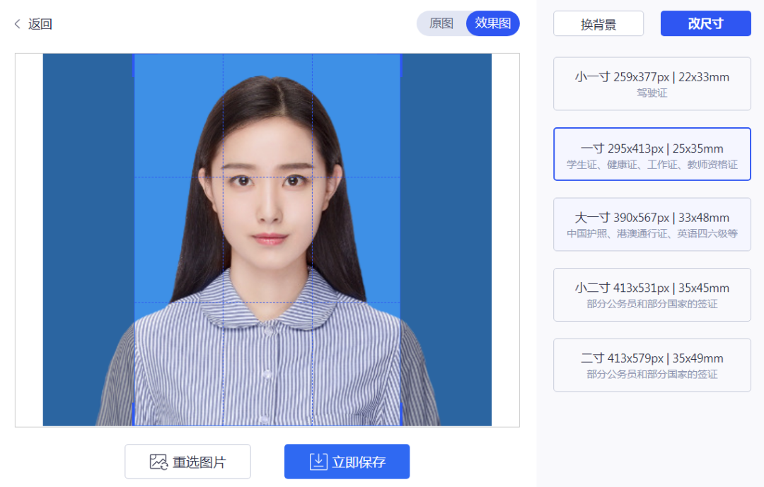 智能证件照功能里也同样可以切换背景颜色,并且裁剪出各类证件照的尺寸格式。