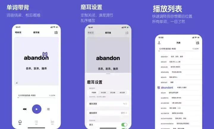 一个完全免费的英语单词学习和练习听力的软件,页面设计非常的小清新,主要可以帮助大家提升英语单词的读音以及听力、考试练习。基本上包含了从中小学、大学、英语四六级、专四、专八、医学等各种英语词汇。