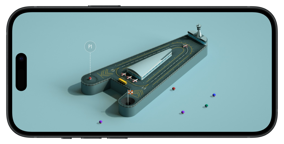 把 P 点的弹珠,通过塔台反弹以后到另一个点入洞,还要避开航班起降