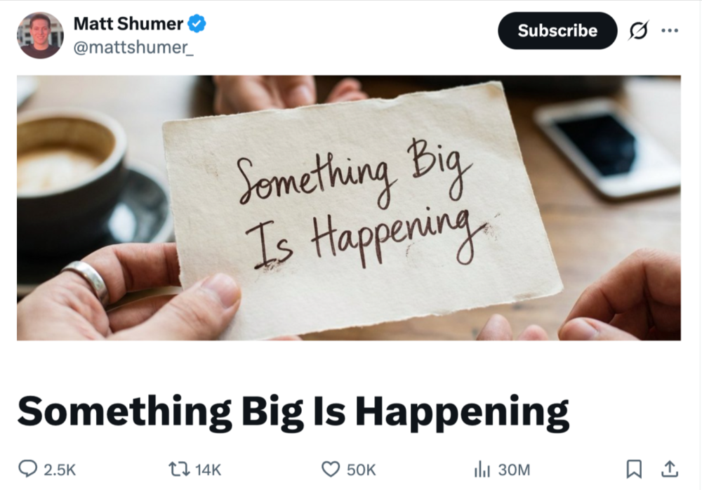 2026年2月11日,科技界发生了一件大事。AI创业者马特·舒默在X平台发表的《大事正在发生》一文,因将AI冲击比作"疫情级颠覆"而引爆全球讨论,浏览量已突破8000万。这场现象级传播不仅因其内容的震撼性,更因为它精准击中了人们对AI加速迭代的集体焦虑。