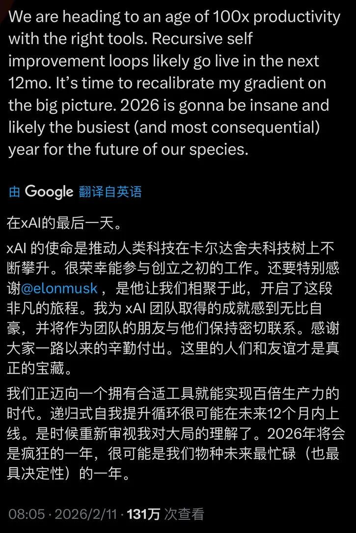 最引人深思的是xAI联合创始人Jimmy Ba的离职声明——这绝非普通的告别,更像是一份提前预警:“我们正迈向一个拥有合适工具就能实现百倍生产力的时代。递归式自我提升循环很可能在未来12个月内上线。2026年将会是疯狂的一年,很可能是我们物种未来最忙碌、也最具决定性的一年。” 这份声明背后,是AI技术迭代周期已压缩至6个月、行业竞争白热化的现实焦虑。