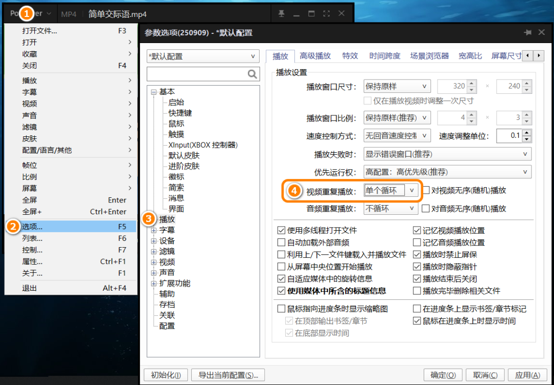 接下来是关键步骤,先找到Potplayer设置→选项→播放→把视频重复播放改成单个循环。