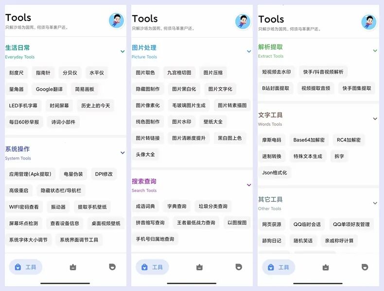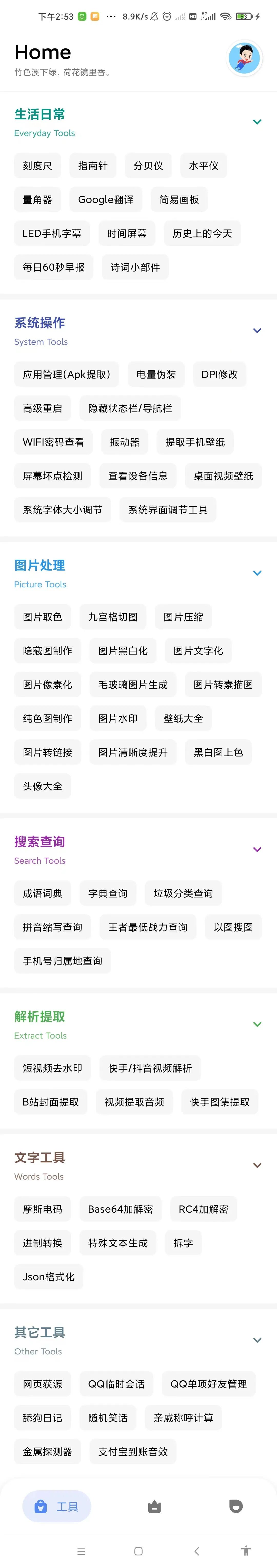 工具箱的名字大家一看就知道,当然是麻雀虽小五脏俱全,分类中有生活日常、系统操作、图片处理、搜索查询、解析提取、文字工具、其他工具等;