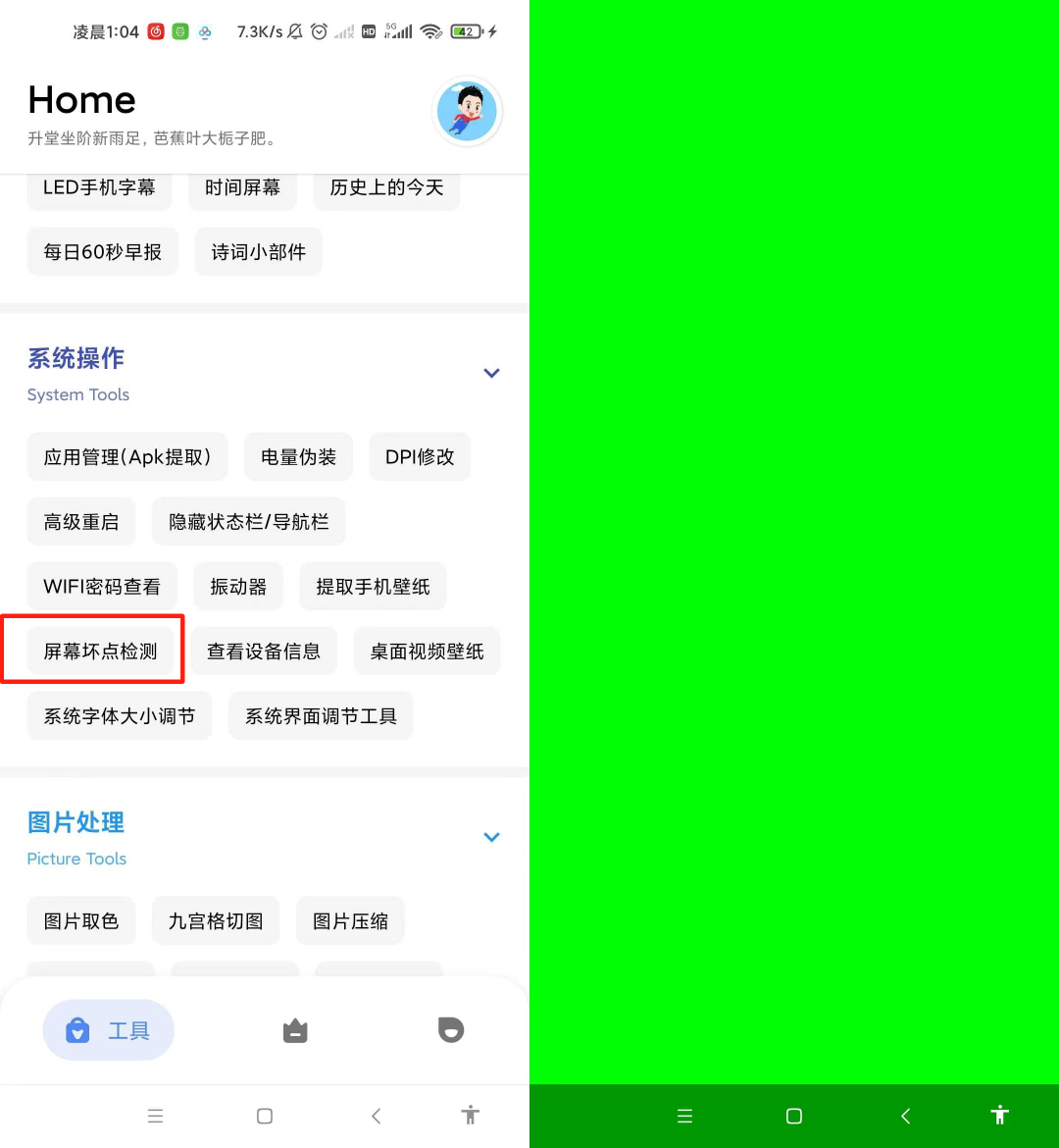 随便点一个功能可以看到刚买手机的大佬经常会用到的一个功能,屏模坏点检查。