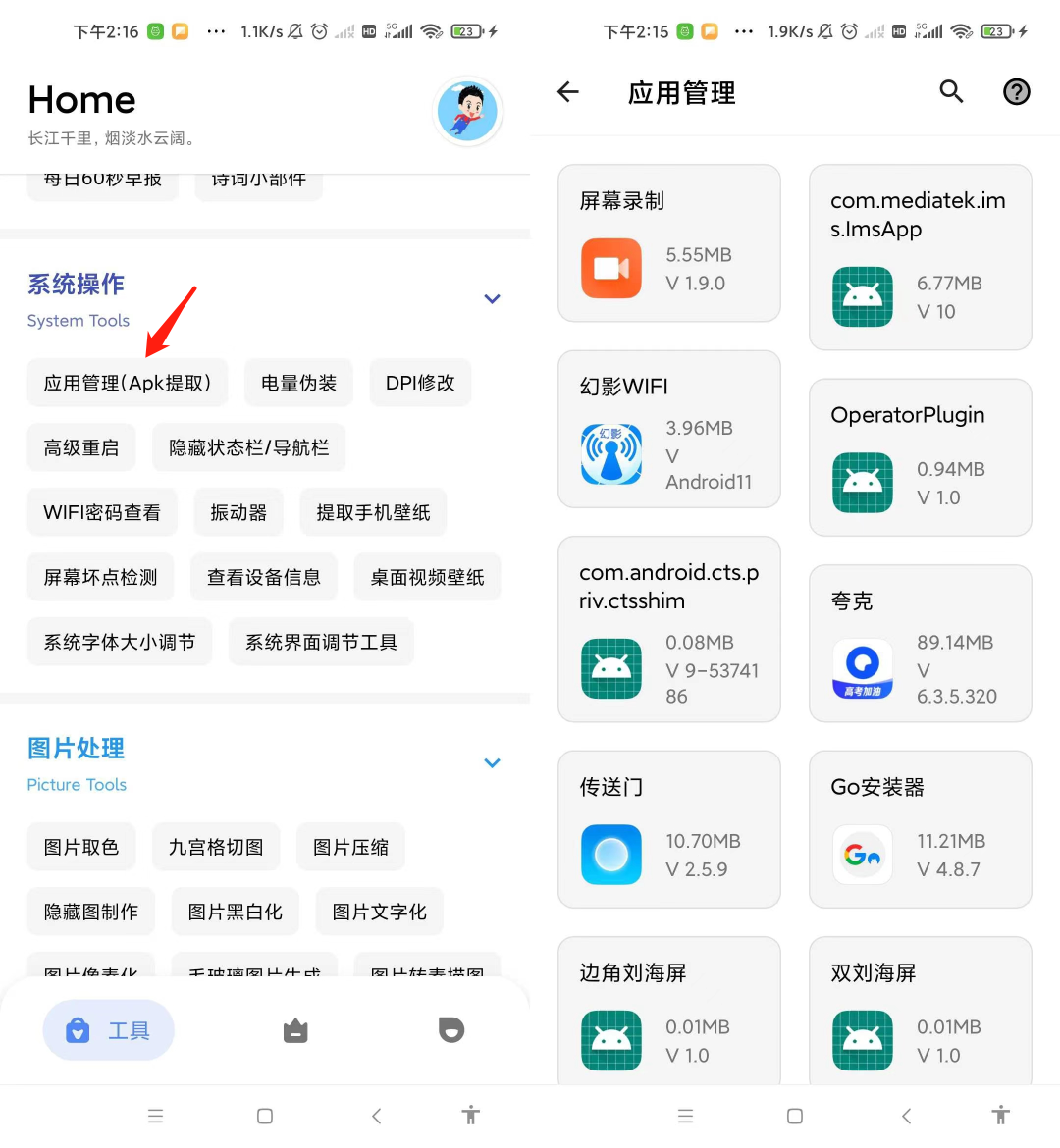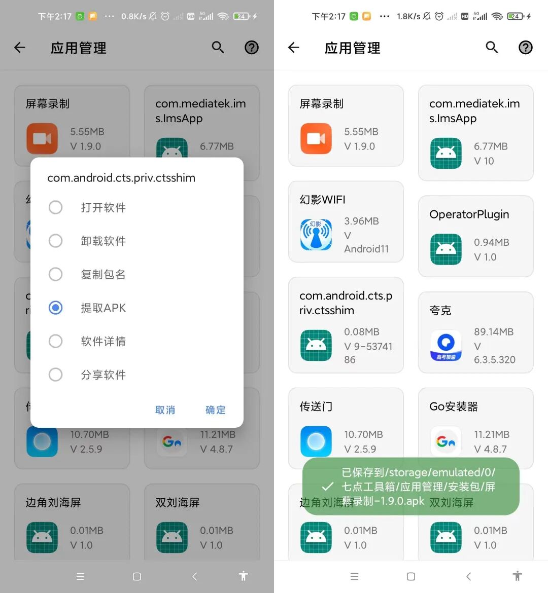 比如说它的应用管理,可以提取APK,这个大家都知道,平常我们安装APP的时候,安装完后会自动删除APK,当你想要分享给朋友的时候,就没办法获取了,这个就是解决这样的问题。
