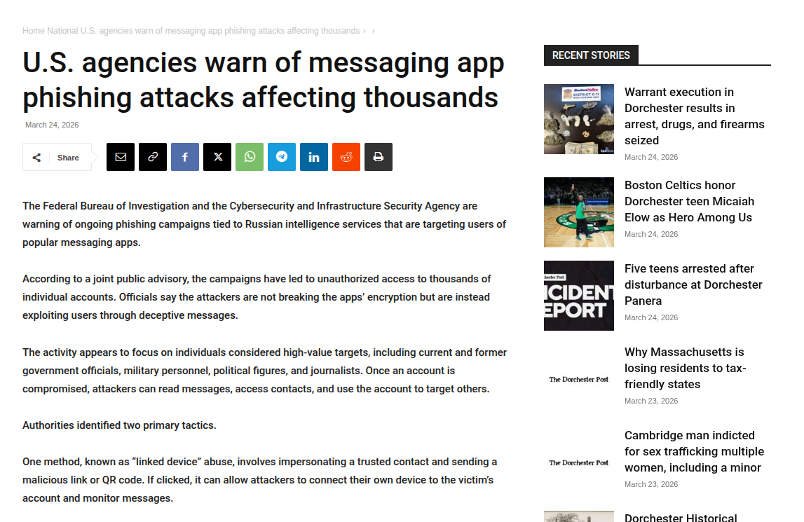 在数字化转型的深水区,即时通讯工具已从单纯的社交软件演变为承载关键基础设施运营、政府决策流转与军事指挥控制的重要节点。根据2026年3月24日美国联邦调查局(FBI)与网络安全和基础设施安全局(CISA)发布的联合公告显示,针对主流商业即时通讯应用的钓鱼攻击正在全球范围内蔓延。值得注意的是,此次攻击并未利用底层加密协议的数学缺陷,而是通过精心设计的社会工程学手段,绕过了端到端加密(E2EE)的防线,直接在用户交互层面对数千名高价值目标(包括现任及前任政府官员、军事人员及记者)实施了渗透。