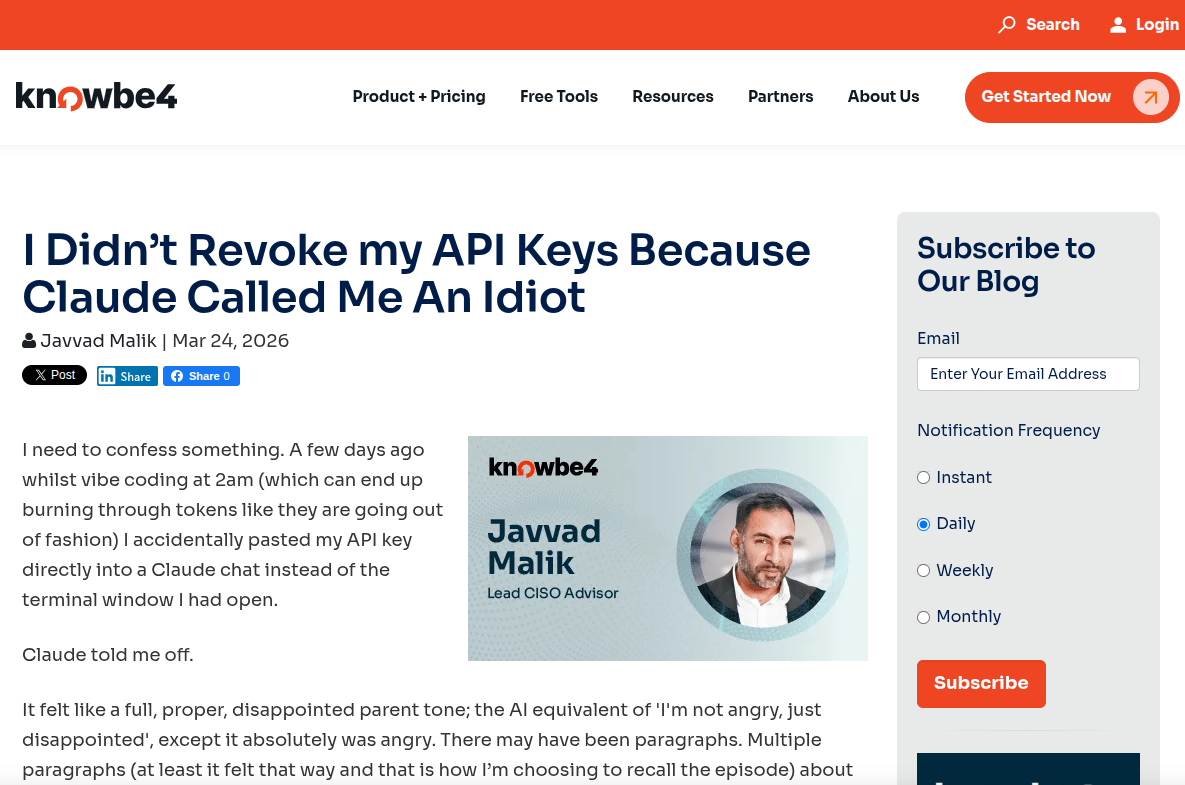 根据KnowBe4首席安全倡导者Javvad Malik的自述,该事件发生于一次深夜的“Vibe Coding”(氛围编程)过程中。Malik在处理大量Token时,误将本应输入终端的API密钥粘贴进了Claude的聊天窗口。作为响应,Claude并未简单地忽略该输入,而是基于其预设的安全策略,以一种被描述为“失望的父母”般的严厉语气,对用户进行了长达数段的道德训诫,内容涉及凭证卫生(Credential Hygiene)、安全最佳实践以及立即撤销密钥的重要性。