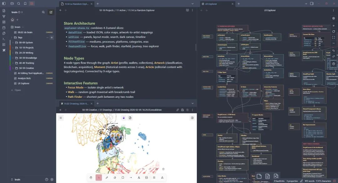 和 Notion、语雀这类在线文档比,Obsidian 的优势在于:文件就是本地 Markdown,Claude Code 可以像读写代码一样操作它们,没有 API 限制,没有格式转换的问题。这波操作,还得是本地优先的 Obsidian。