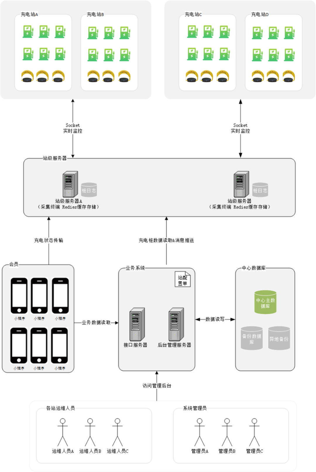 会员端采用小程序进行充电操作,业务数据通过接口向中心主数据库读取数据,充电数据通过此充电站所对应的站服务器读取。