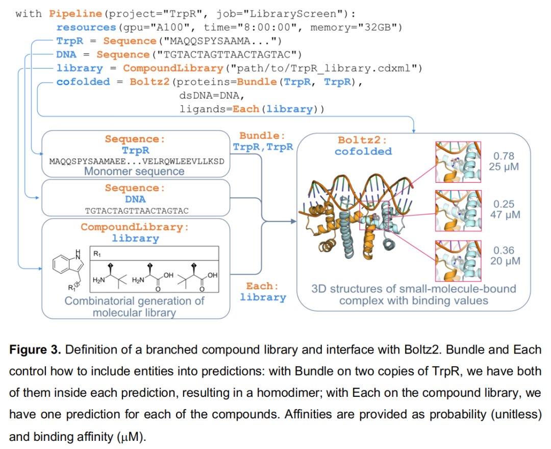 Bundle vs Each 的精妙语义:Bundle(TrpR, TrpR) 指示 Boltz2 将两条 TrpR 链置于同一预测中(生成同二聚体),而 Each(library) 指示对库中每个配体分别运行一次预测,最终得到 N 个独立的三元复合物预测;