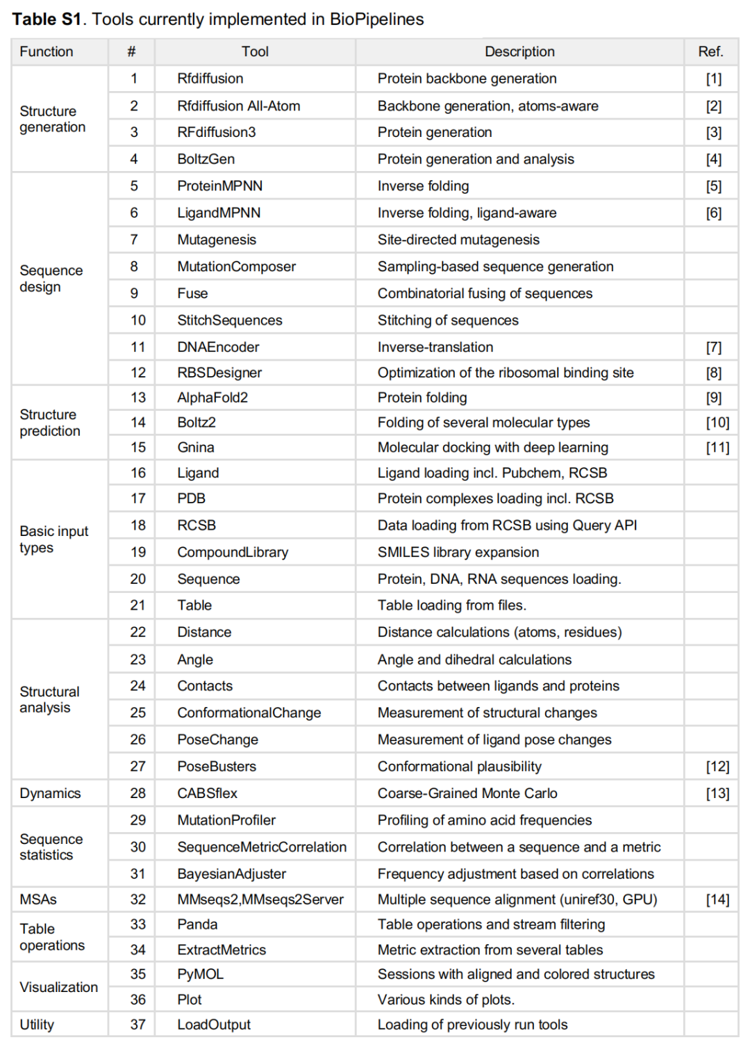 根据论文正文及 Table S1,BioPipelines 集成的工具(>30 个)按功能分类如下: