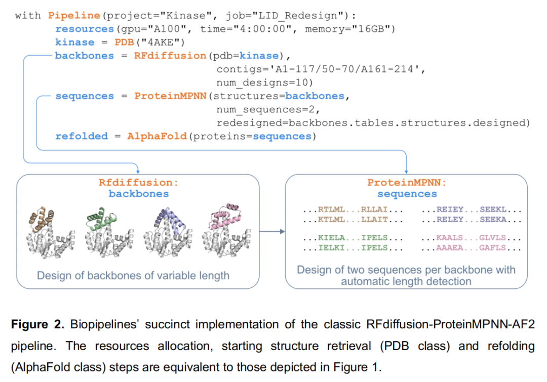 contigs 参数中 A1-117/50-70/A161-214 是 RFdiffusion 的标准 contig 语法,表示固定 A1-117 和 A161-214 区域,在其间扩散生成长度为 50-70 aa 的新片段;redesigned=backbones.tables.structures.designed 这一参数调用是框架模块化的典型体现——RFdiffusion 在运行时通过 contig 采样确定了每个骨架中被设计的具体位置(长度可变),这一信息以结构化表格形式传递给 ProteinMPNN,后者自动仅对新生成的骨架片段设计序列,而不对固定区域进行重设计,无需任何手工解析;