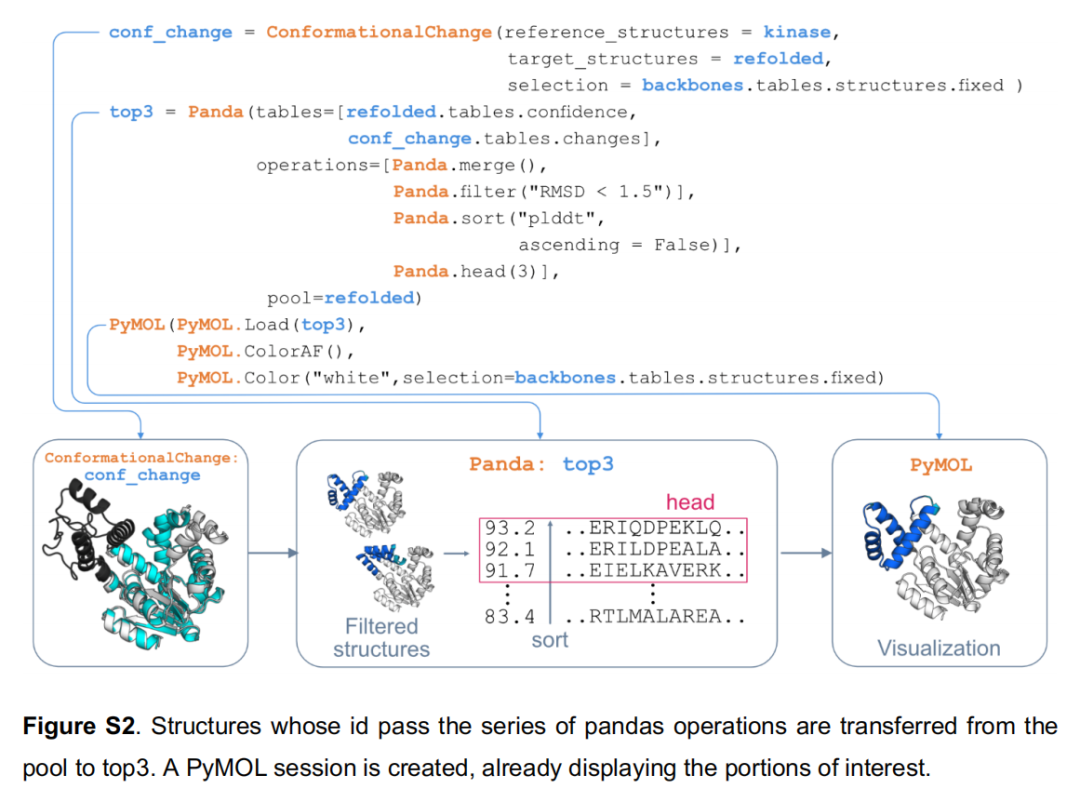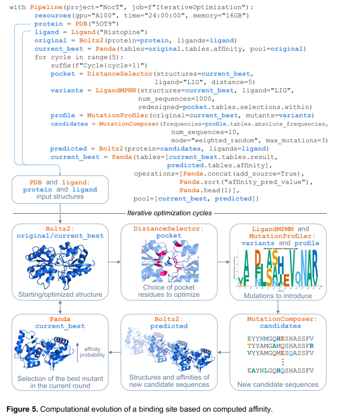 current_best = Panda(tables=[current_best.tables.result, predicted.tables.affinity], operations=[...], pool=[current_best, predicted]) 展示了 Panda 工具在迭代场景下的核心能力:跨轮次合并亲和力数据,自动选取最优结构作为下一轮起点,所有文件管理由框架自动处理;suffix(f"Cycle{cycle+1}"):为每轮生成的文件添加循环编号后缀,保证多轮输出不相互覆盖,便于事后回溯;BioPipelines 的交互式模式支持两种典型工作流: