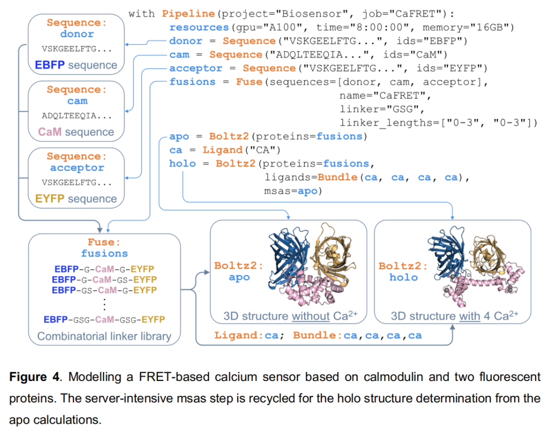 科学目标:设计基于钙调蛋白(calmodulin)的基因编码 FRET 钙传感器,系统筛选 EBFP(供体)-钙调蛋白-EYFP(受体)三域融合蛋白的 linker 长度组合,在 apo 和 Ca²⁺ 结合态下预测结构并比较荧光基团间距。