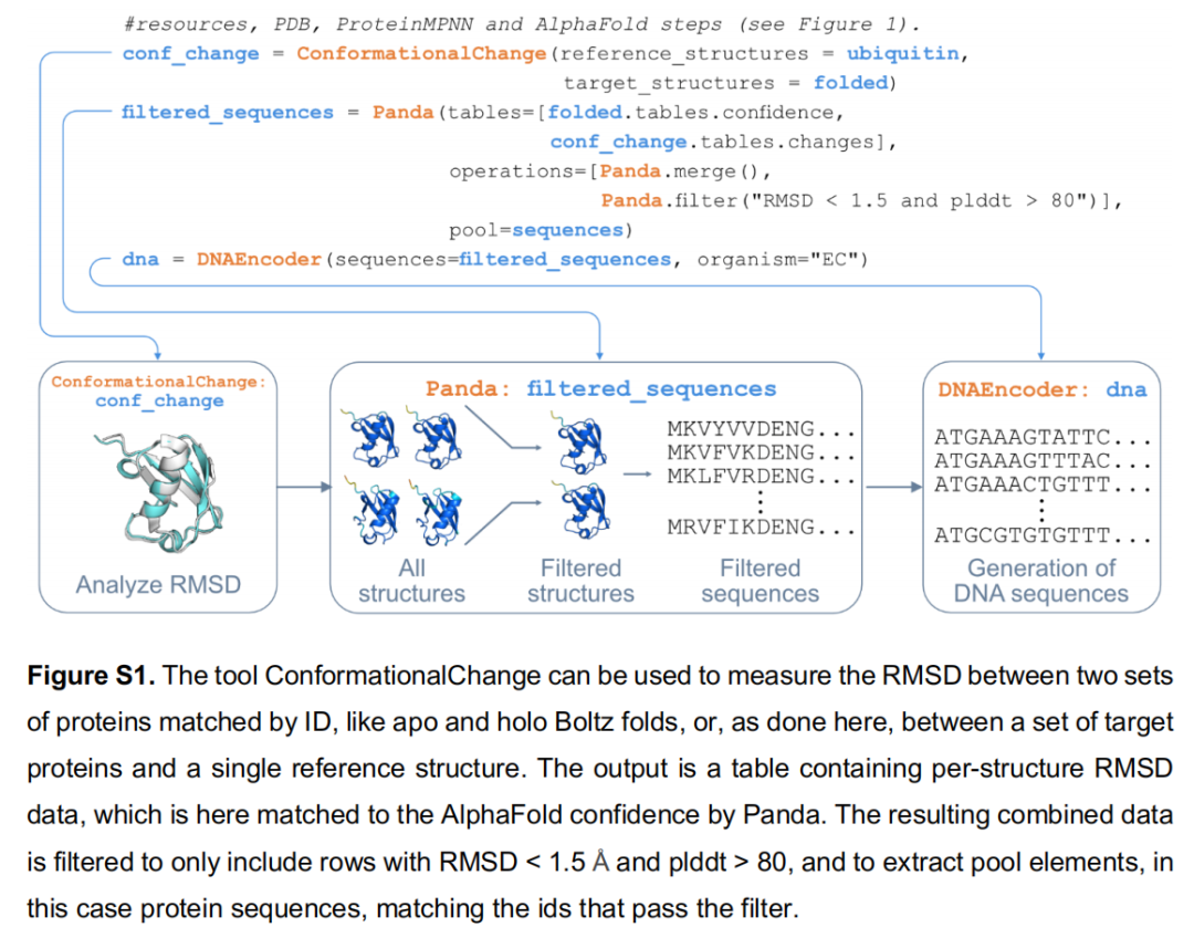 ProteinMPNN 调用专门针对可溶蛋白训练的模型权重(soluble_model=True),相比通用模型对溶解度预测更可靠;DNAEncoder 调用 CoCoPUTs 数据库提供的物种特异性密码子使用频率表,采用"阈值加权采样"策略:优先使用高频密码子以避免稀有密码子,同时引入随机性以降低基因重复序列(有利于基因合成);RMSD 计算 + pLDDT 阈值过滤(via Panda),对设计结果进行自动质控,仅保留与亲本结构高度相符且预测置信度高的变体(见 Figure S1)。