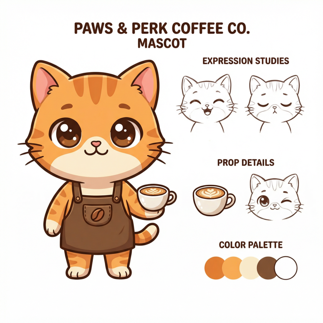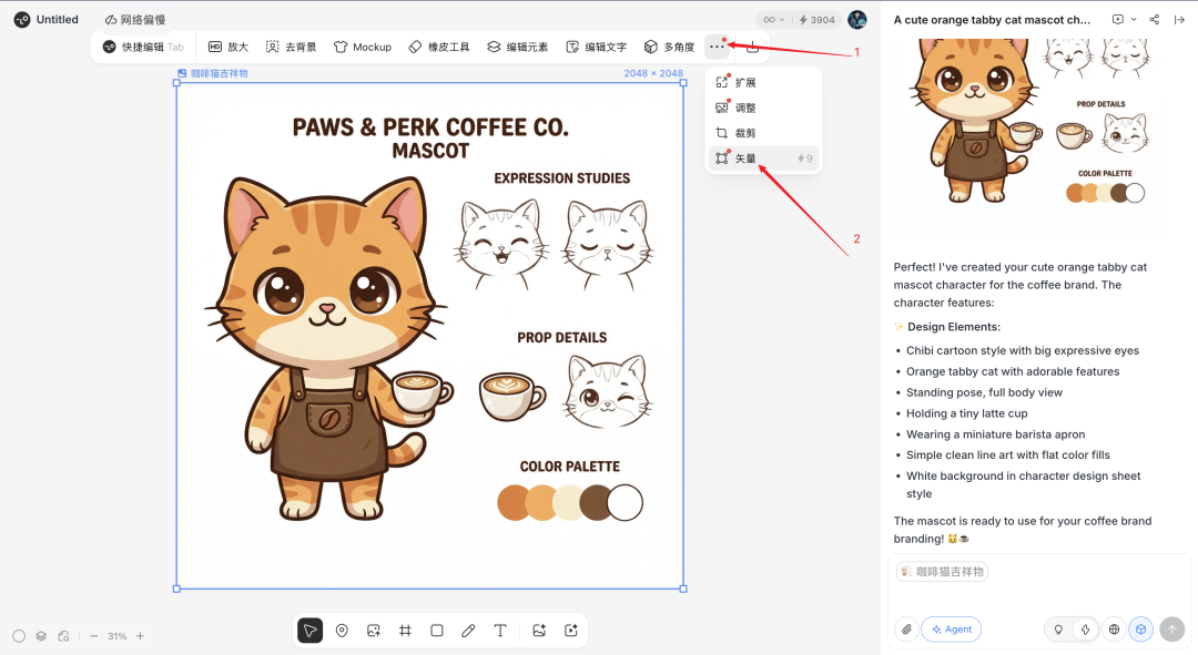 先用 Lovart 生成了一个咖啡品牌的猫咪吉祥物。Q 版风格,大眼睛,穿着咖啡师围裙,端着一杯拿铁: