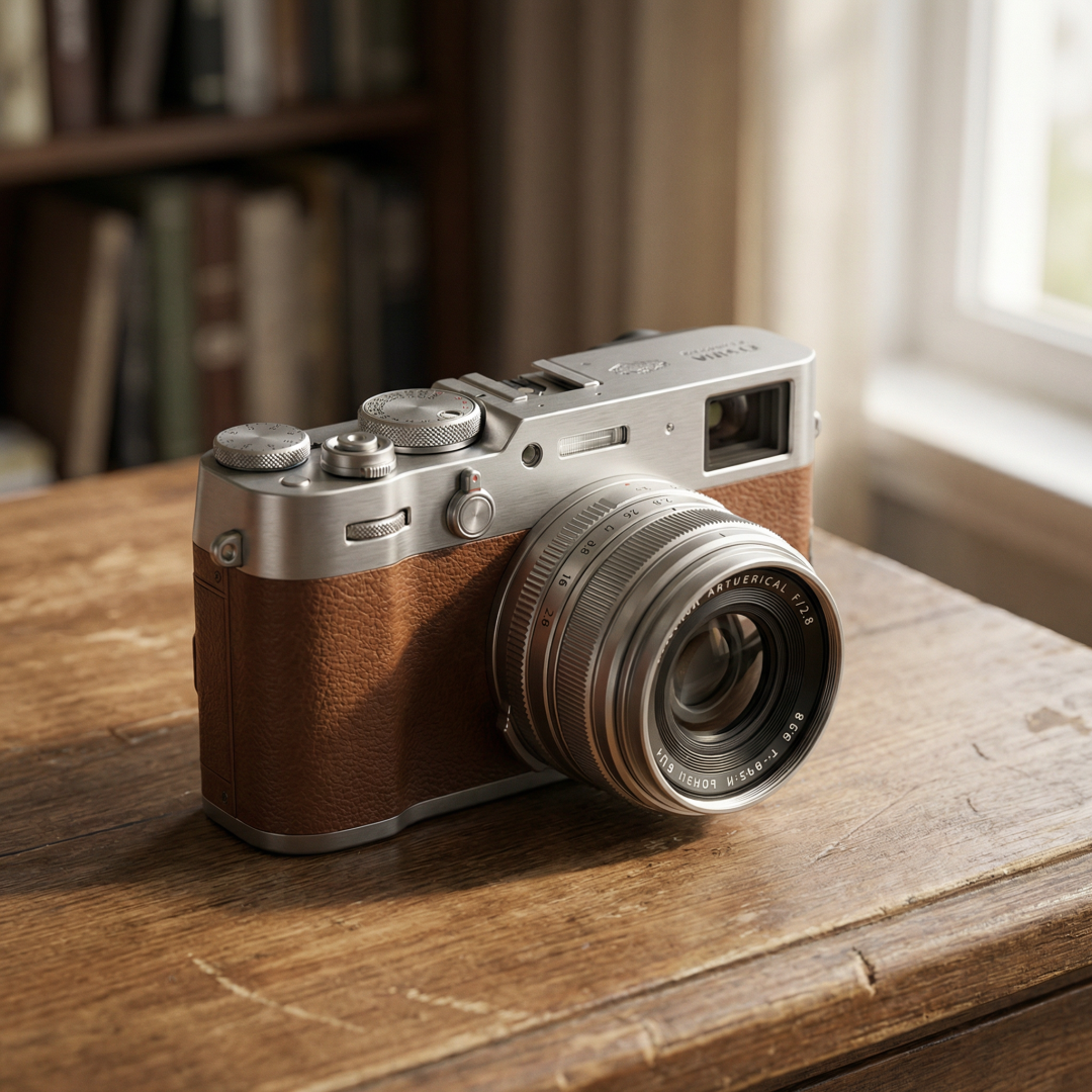 第三个场景试商业摄影。生成了一台复古胶片相机,棕色皮革握把 + 拉丝银金属机身,放在木桌上,窗户自然光从右侧打进来: