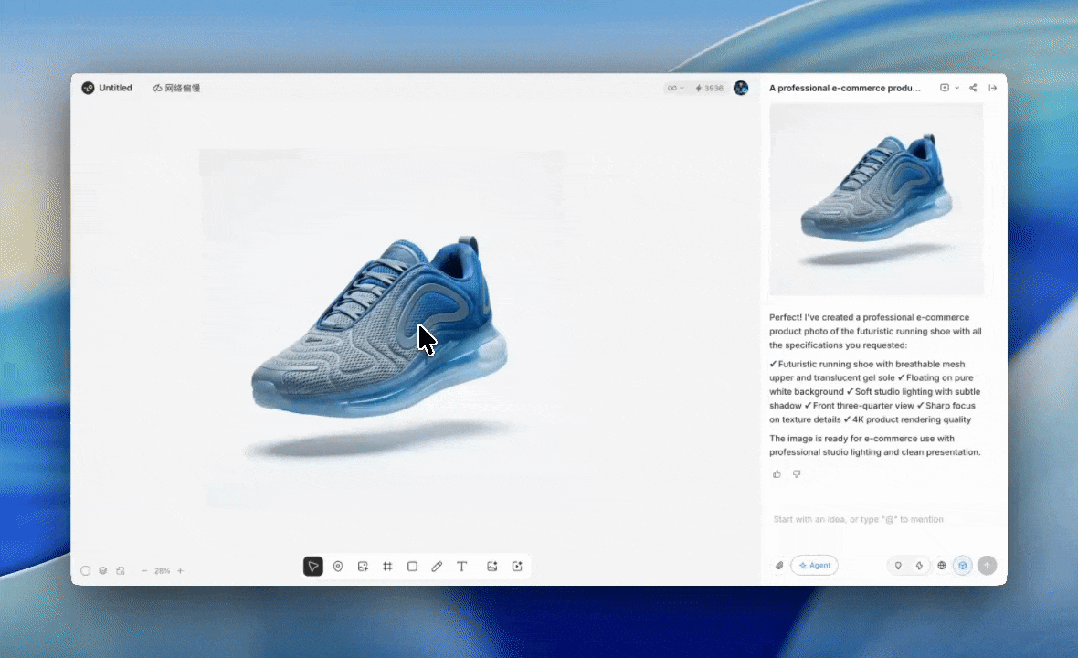 我用 Lovart 生成了一只未来感的运动鞋,透气网面 + 透明气垫底,白色背景悬浮。出图质量说实话有点惊到我,直接就能当主图用的水平: