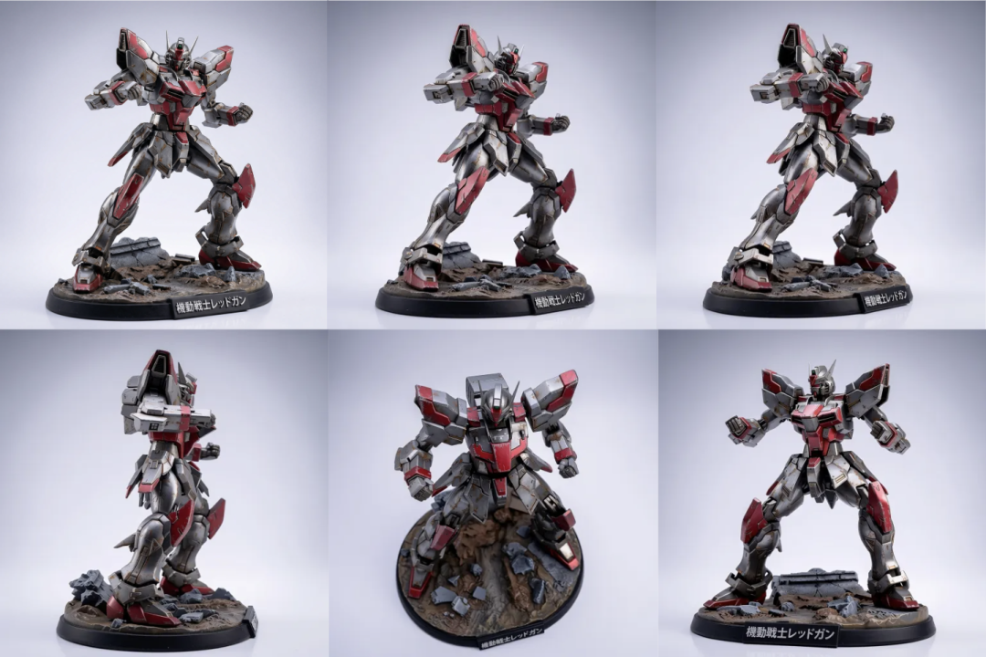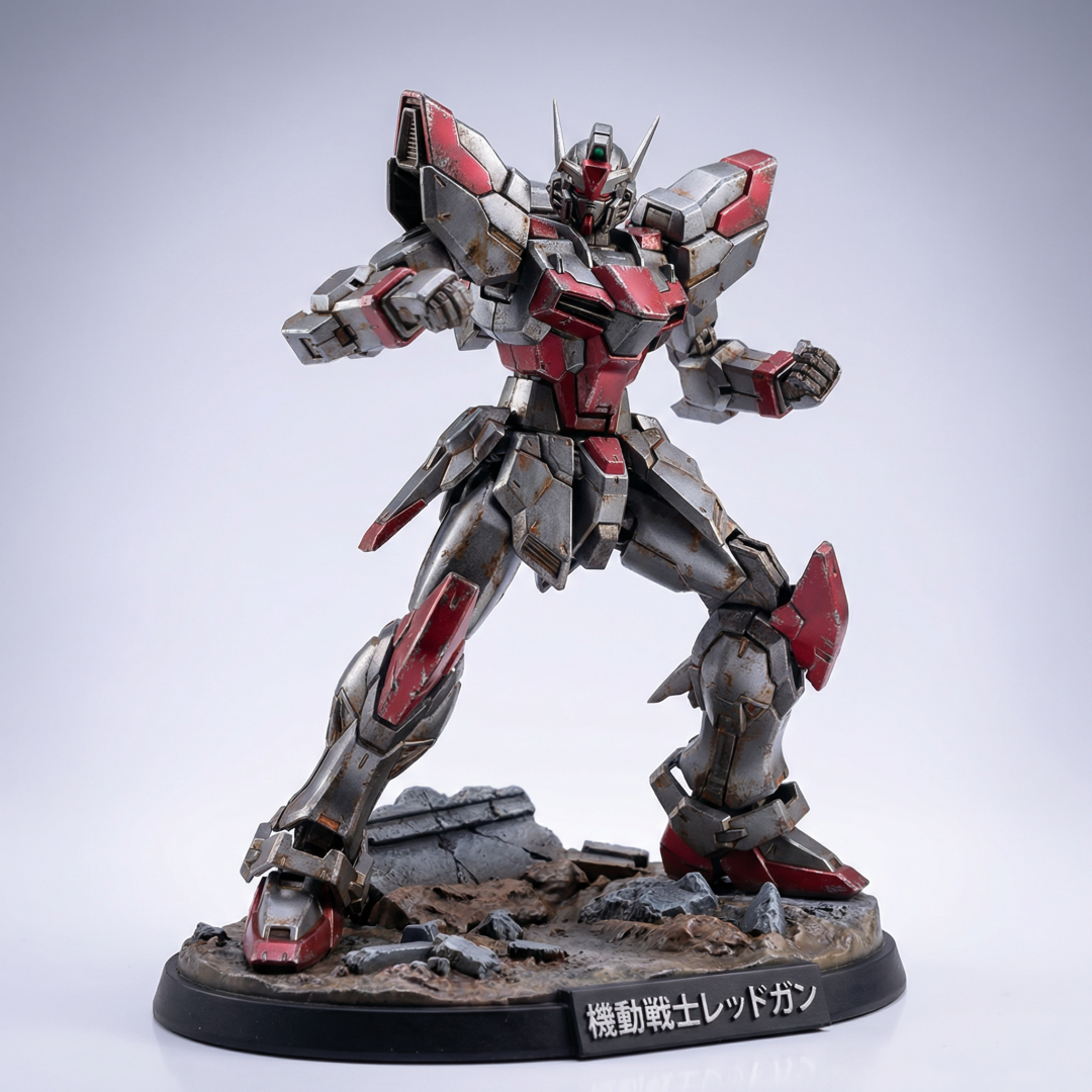 第二个场景换到手办。我生成了个机甲战士手办,枪灰色 + 深红配色,战斗姿态带底座,做旧质感拉满: