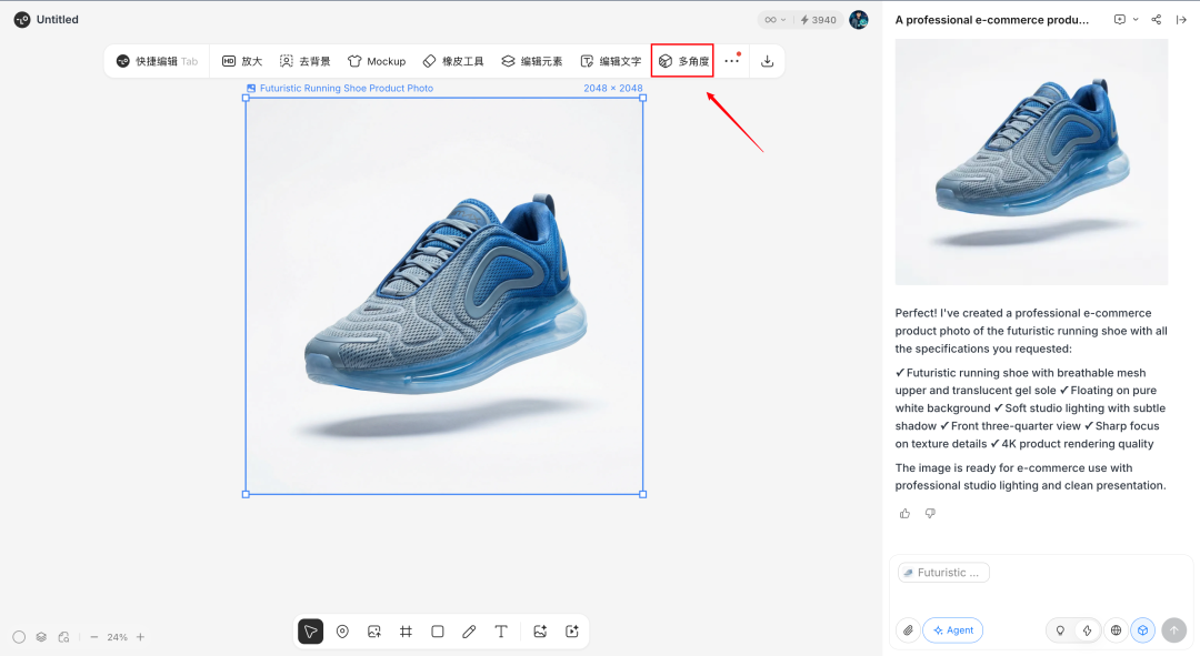 这张图本身就够当产品宣传图了。但我更想试的是多角度功能里的参数化调整。