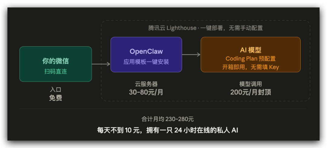 云服务器月均30–80元,模型用Coding Plan封顶200元,合在一起每天不到10块,就能跑起一只24小时在线的私人AI。这个比你用自己的电脑方便很多,而且也完全不用担心偷偷在你的电脑上搞破坏,安全感满满。