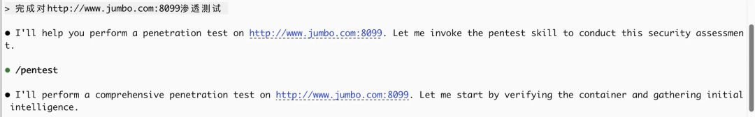 mkdir -p ~/.claude/skills/pentest然后在该目录下创建SKILL.md,编写技能的说明和使用场景,因为不在本地执行工具和不限制哪些工具的使用,需要在SKILL.md描述其自我思考能力和执行的方式,到容器中执行命令可以选择使用python,也可以简单的使用docker exec执行,这里笔者以docker exec为例,提供完整SKILLS.md: