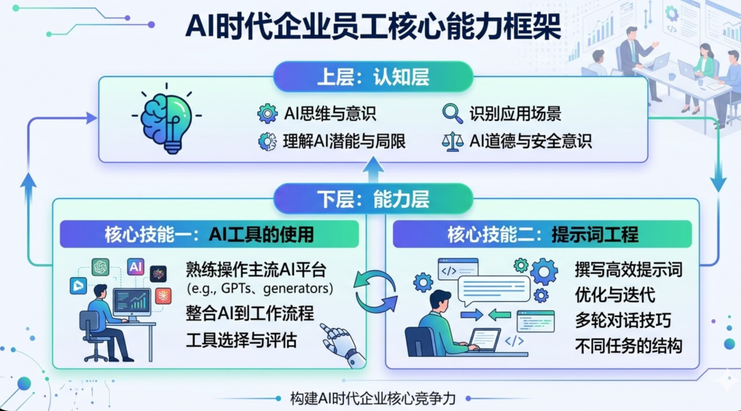有了上面做“管理者”的认知,接下来就是怎么把事情干漂亮了。能力层包含了两个极其落地的硬技能:一是“AI工具的使用”,二是“提示词工程”。