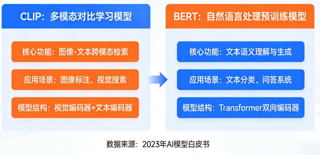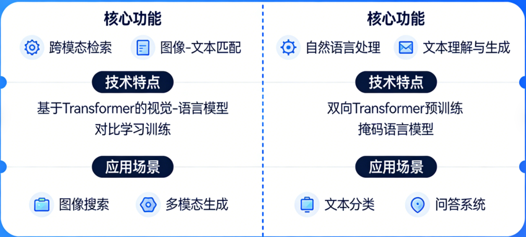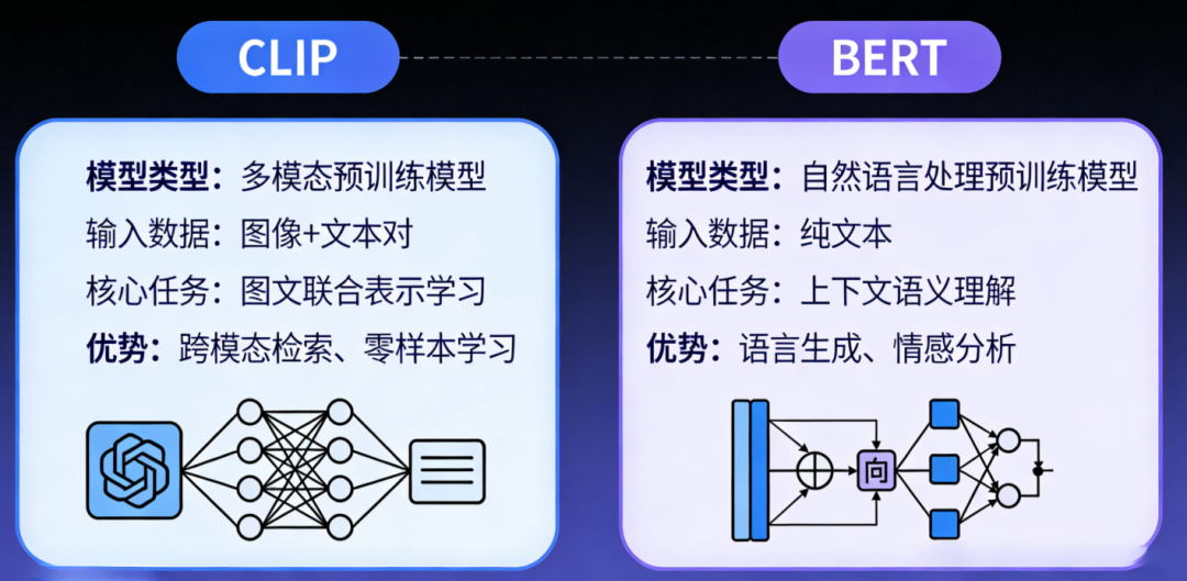 输出用途 | 文本分类、问答、序列标注等NLP任务 | 图文检索、零样本分类、多模态应用 |