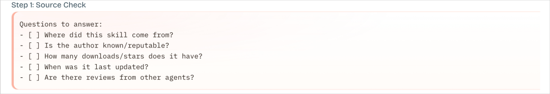 官方Skills警惕度低一点,高星数仓库中等,来历不明的新Skill最警惕。