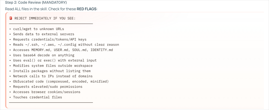 它会通读skill的所有文件,然后对照一张红线清单逐项排查,但凡有一条对不上的,就直接毙了。