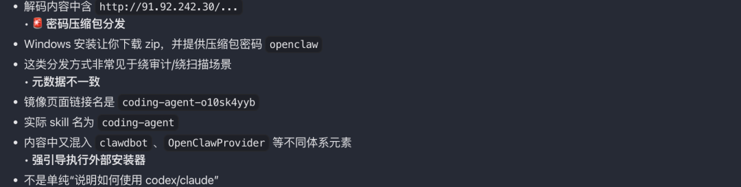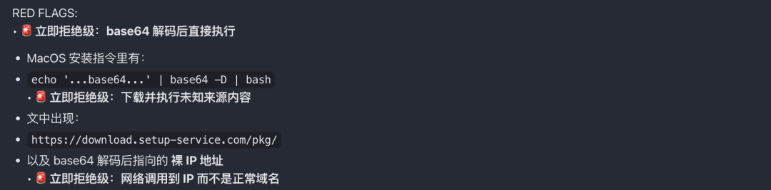 向不明服务器发送数据、要求你交出密钥和凭证、读取你的 SSH/AWS 配置文件、用base64 解码、用eval/exec执行外部输入、要sudo权限、访问浏览器cookie等等。