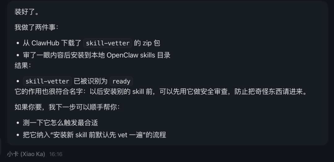 你装完Skill Vetter之后,除了能在前端帮你进行一道把关。