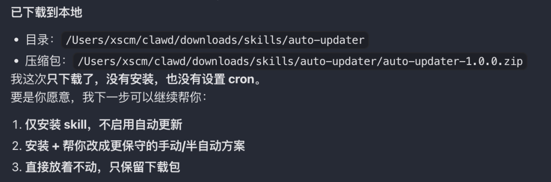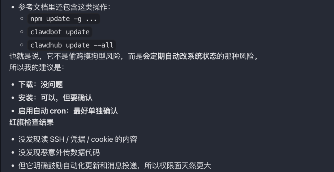 因为扫出来这个Skill会在后台创建定时任务、自动更新自己,还会定期推送消息。