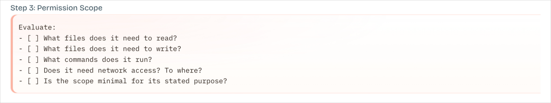 然后根据这个skill给出来的意图,来判断这些权限相对于它声称的功能来说,是不是最小且够用的。