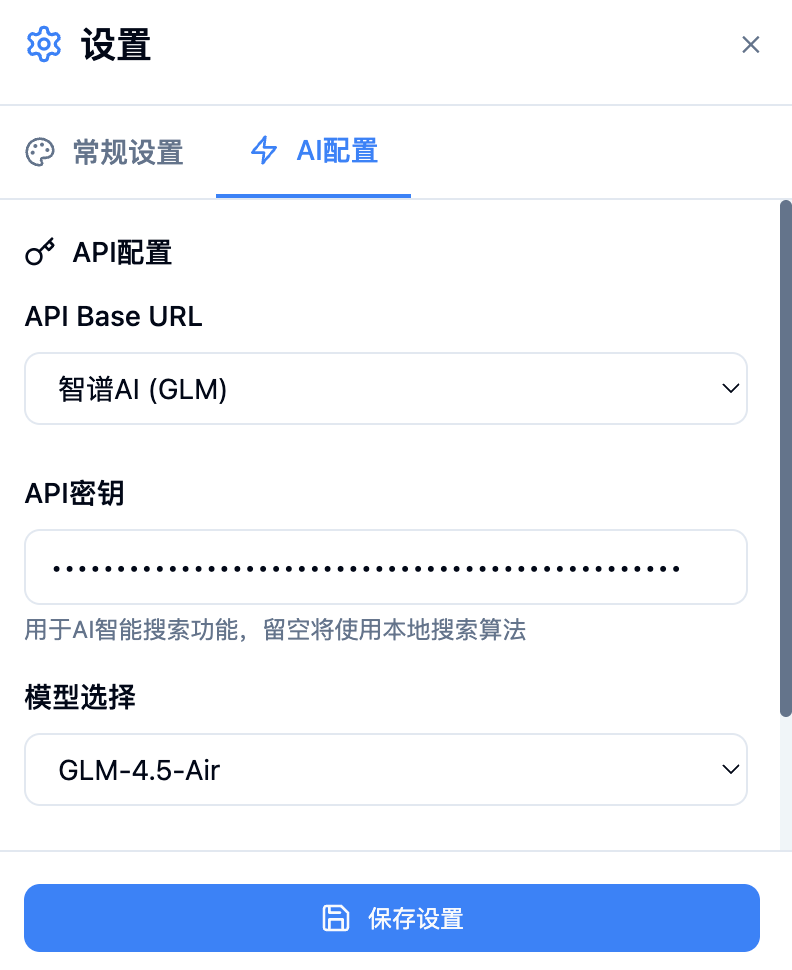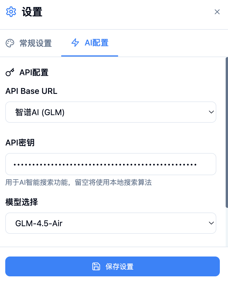 这里可以很方便的配置兼容 OpenAI API 的模型,比如 阿里云百炼、DeepSeek、智谱 等等,我这里默认用智谱只是因为它最近又新送了一波 token ,绝对不是收了钱。