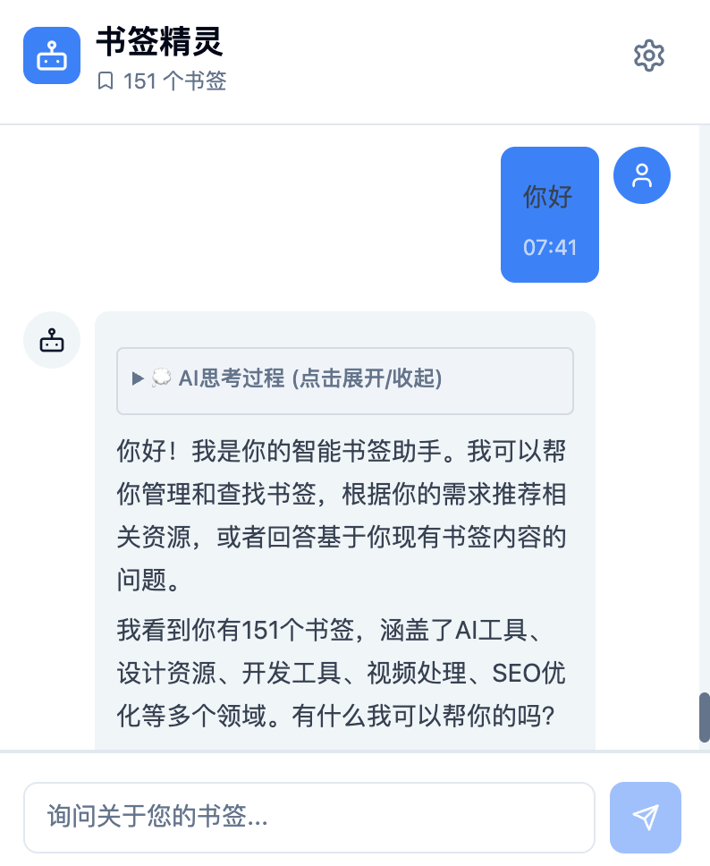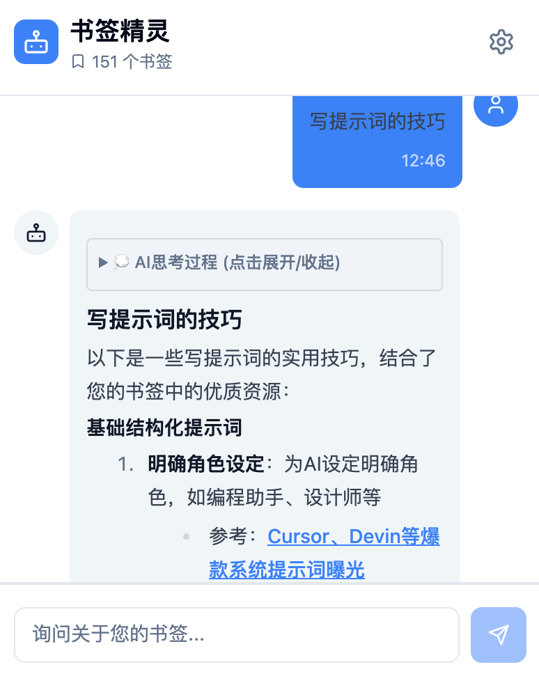 这个插件的功能非常简单,就是以对话的形式,让 AI 从所有书签中查找到需要的书签: