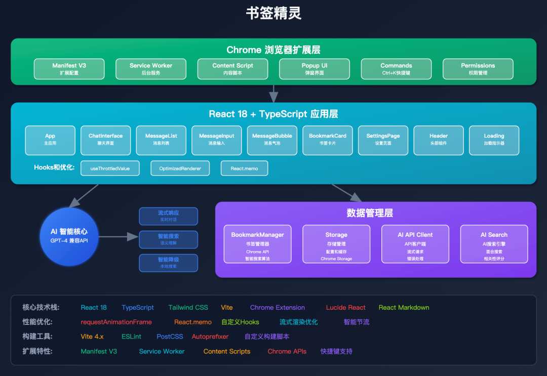 所以我就想,能不能做一个搜索功能,让我用自然语言从收藏的所有书签里快速找到我要的网站。然后我(其实代码都是 AI 写的)就写了一个 Chrome 插件——书签精灵,开源免费无毒畅享,地址在文末。