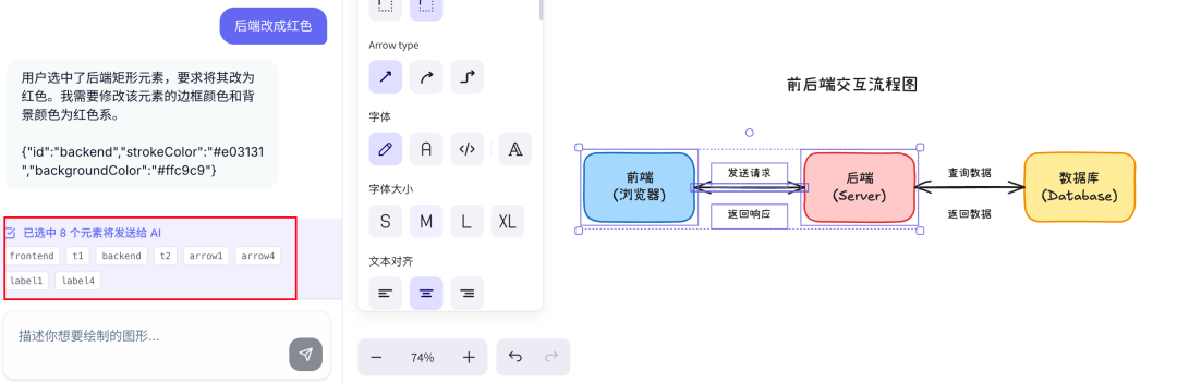 点击选中元素后,对话框的上方会显示元素的信息,在发消息时会把元素信息也一起发送给 AI,这样 AI 就能基于画布的状态实现精确修改,“指哪改哪”。